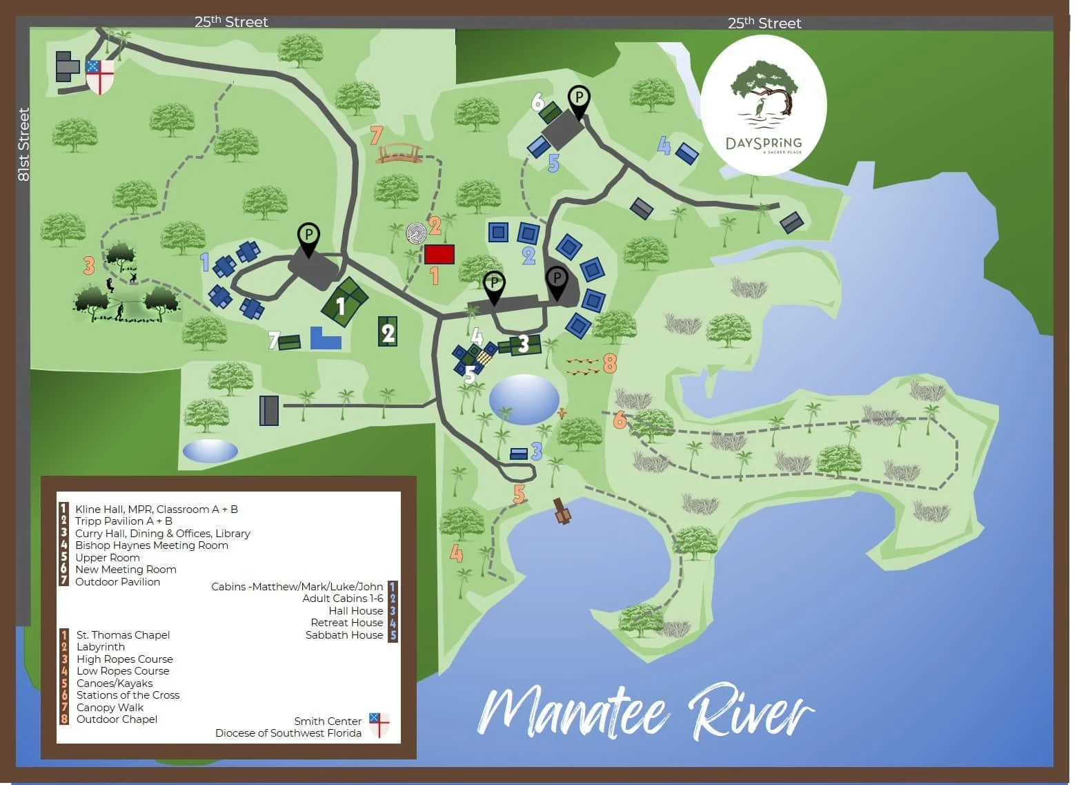 You will have the opportunity to explore the myriad of activities that the 97 acre property has to offer. Whether you’re seeking adventure on the low and high ropes course, soaring through the trees on a zip line, or paddling along the Manatee River in a canoe, each activity will invigorate your spirit. The labyrinth and small chapel will provide tranquil spaces for meditation and contemplation, while the swimming pool will invite you to refresh and unwind.